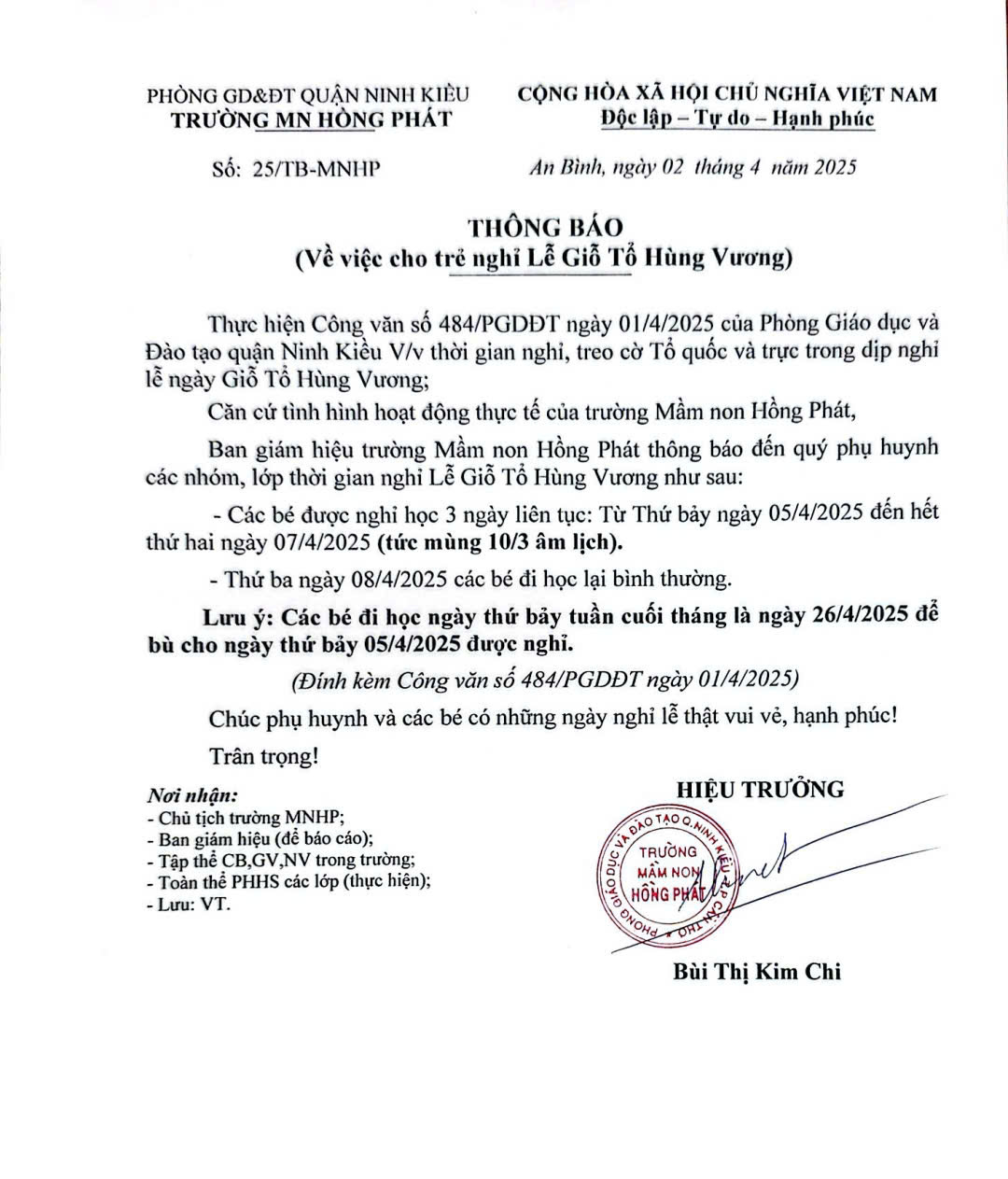 Mong rằng, ngày lễ Giỗ Tổ sẽ giúp các con có thêm tình yêu và niềm tự hào về dân tộc. Chúc các thầy cô, quý phụ huynh và các con luôn mạnh khỏe, hạnh phúc và phát triển hơn nữa trong cuộc sống.