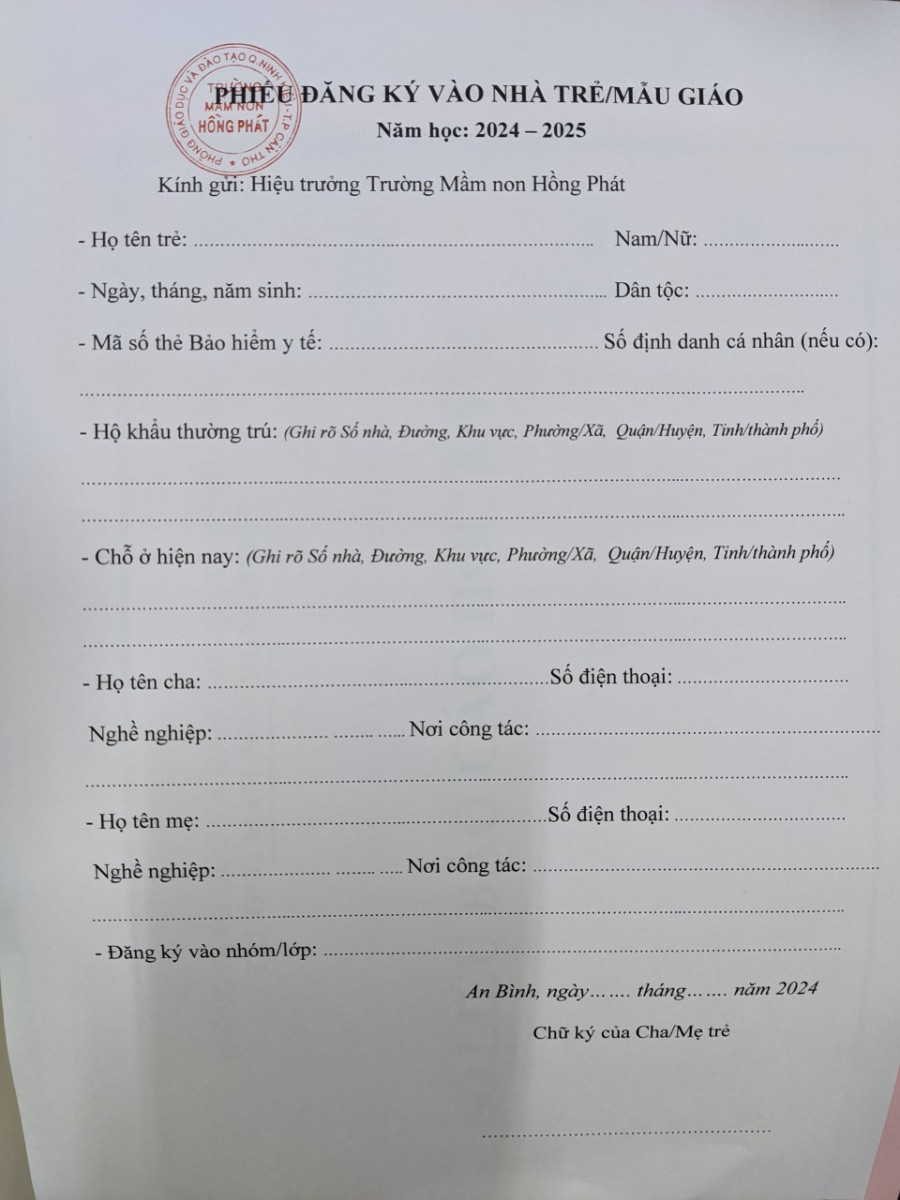 Phụ huynh mua hồ sơ nhập học và nhận tư vấn trực tiếp tại phòng Hành chánh quản trị trường MN Hồng Phát trong giờ hành chánh từ thứ 2 đến thứ 7 hoặc nhận tư vấn qua số điện thoại: 02923 733 018. Hoặc website: https://hongphat.kiddihub.com/