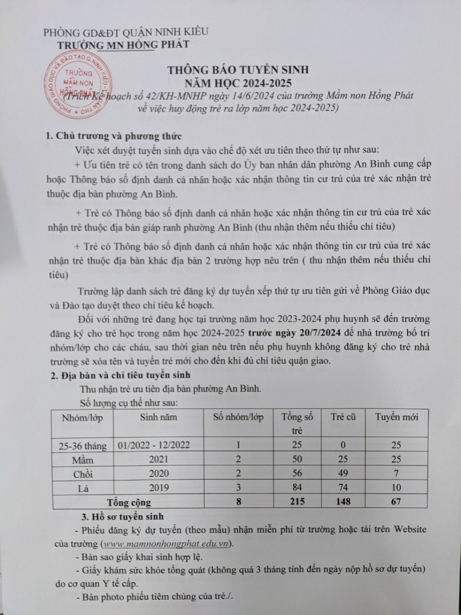 Trường Mầm non Hồng Phát trân trọng thông báo đến phụ huynh học sinh công tác tuyển sinh trẻ năm học 2024 - 2025