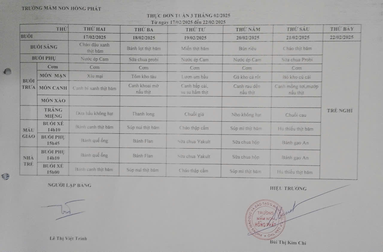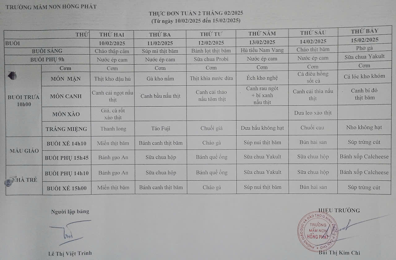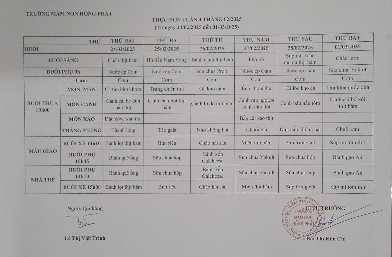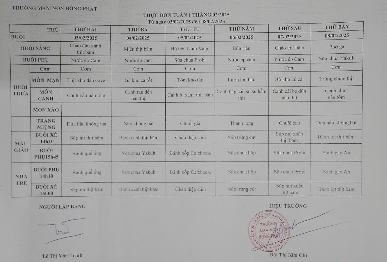 25 01 Trường MN Hồng Phát công khai thực đơn cho trẻ tháng 02/2025 25/01/2025 By Hồng Phát Công Khai,